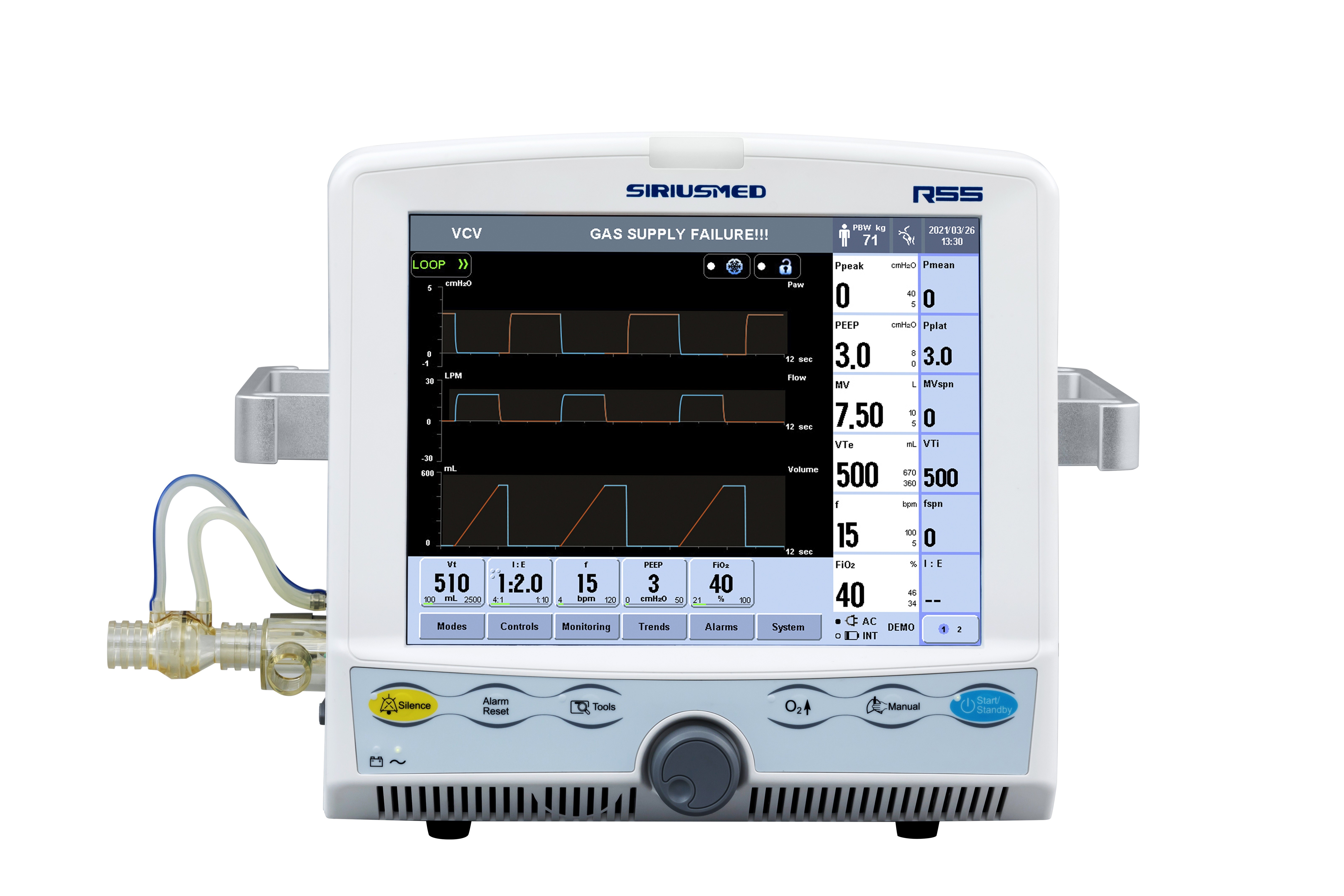 Volume de marée Volume minutieux Concentration en oxygène Pression de voie aérienne Fréquence respiratoire ETCO2 Fréquence du pouls Occlusion de circuit Alarme d'Apnea Alarme de BAS de l'APPROVISIONNEMENT O2 Alarme d'échec de canalisations Alarme de puissance de batterie basse Alarme déchargée par batterie Silence d'alarme |
